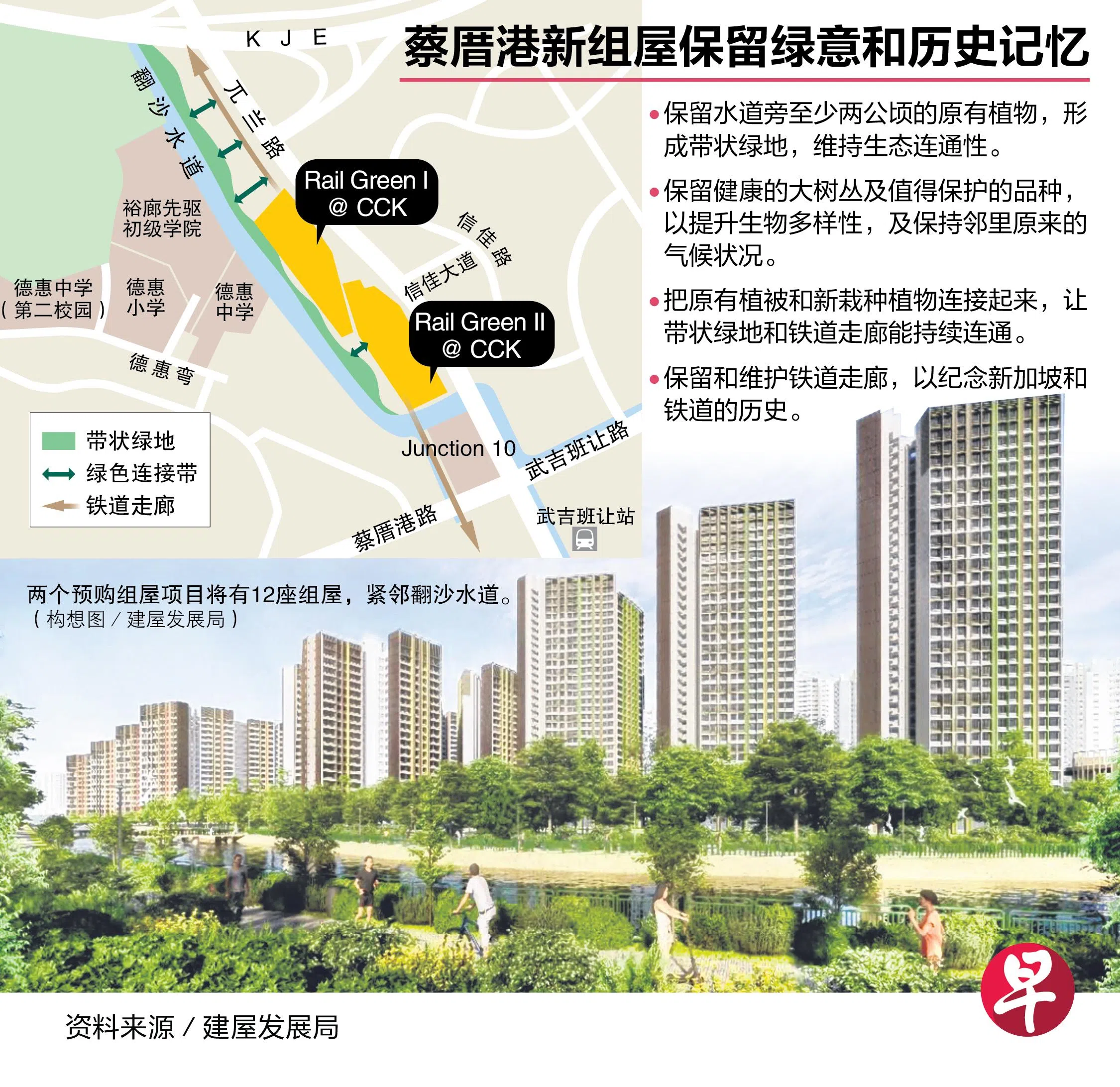 这两个项目分别取名Rail Green I @ CCK和Rail Green II @ CCK,凸显它们紧挨着铁道走廊的地点特色,将在本月初的预购组屋销售活动中推出,等候时间为三年零三个月至四年。