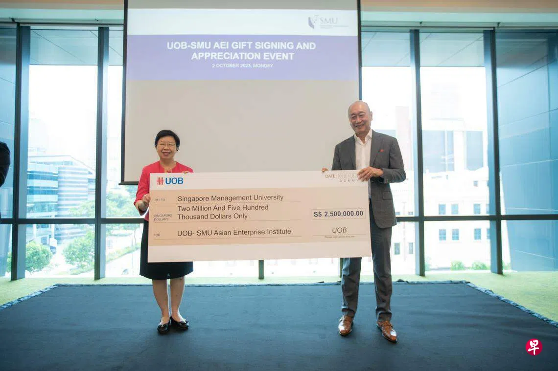 新大星期一(10月2日)发文告说,为进一步支持大华银行—新大亚洲企业研究院(UOB-SMU Asian Enterprise Institute,简称UOB-SMU AEI),大华银行在此前总额1000万元的投资基础上,再捐赠250万元,以支持研究院计划下,本地企业和新大学生在知识和资源方面的交流。