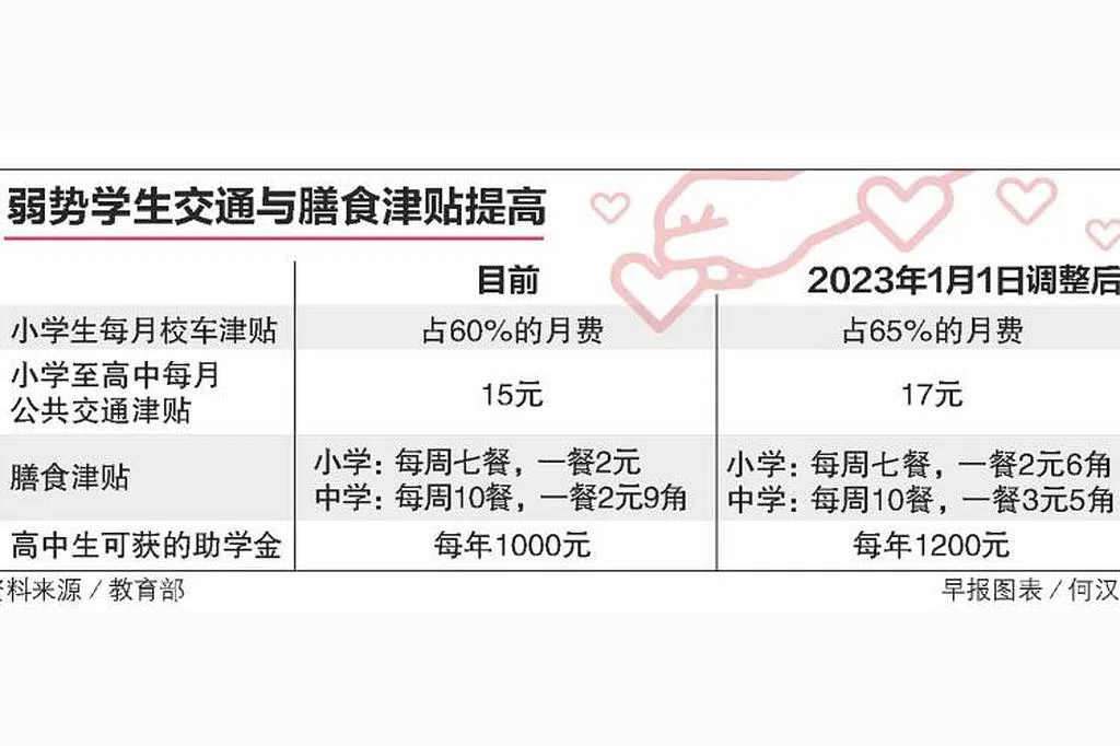 今年1月起,参与教育部经济援助计划的学生,每月可获得的校车津贴从校车收费的60%增至65%。需要更多资助的学生可向学校提出申请。至于特别教育学校,符合条件的学生可向新加坡协助残障者自立局(SG Enable)申请残障者交通津贴。去年7月起,津贴援助额已增加。