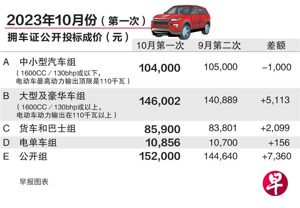 另外,货车和巴士组(C组)成价上涨2099元(2.5%),报8万5900元。电单车组(D组)成价增加156元(1.5%),报1万零856元。