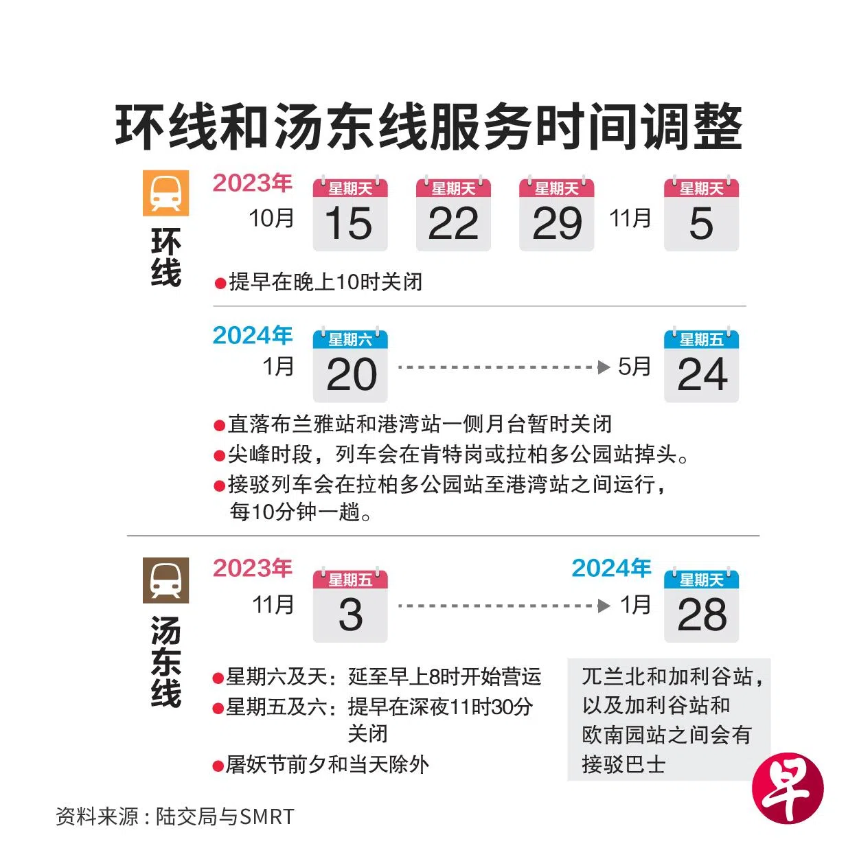 配合地铁环线第六阶段和汤申—东海岸线第四阶段的系列系统整合工程,从10月15日起至明年1月,这两条地铁线在特定日期会提早结束或延迟开始服务时间;明年1月中起环线两个地铁站一侧月台也会暂时关闭。