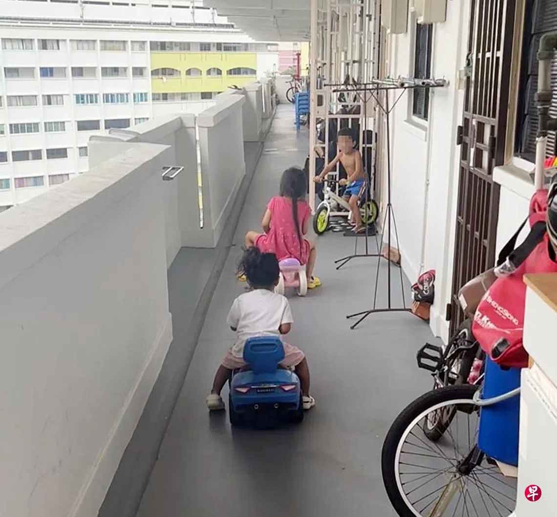 记者走访时,事主努莱萨(39岁,家庭主妇)透露,她在上述组屋住了两年,五岁女儿周末时会与其他邻居小孩在走廊上玩耍,每次大约半小时,九岁儿子则会在旁照顾。