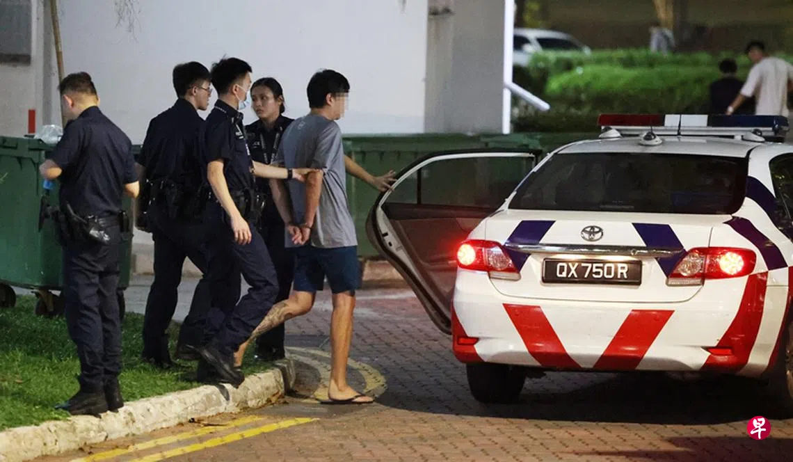 夫妻闹纠纷,丈夫疑夺刀冲下楼,在组屋楼下附近的幼儿园徘徊,惊动警员到场将他逮捕,现场也起获一把利刀,妻子受轻伤。