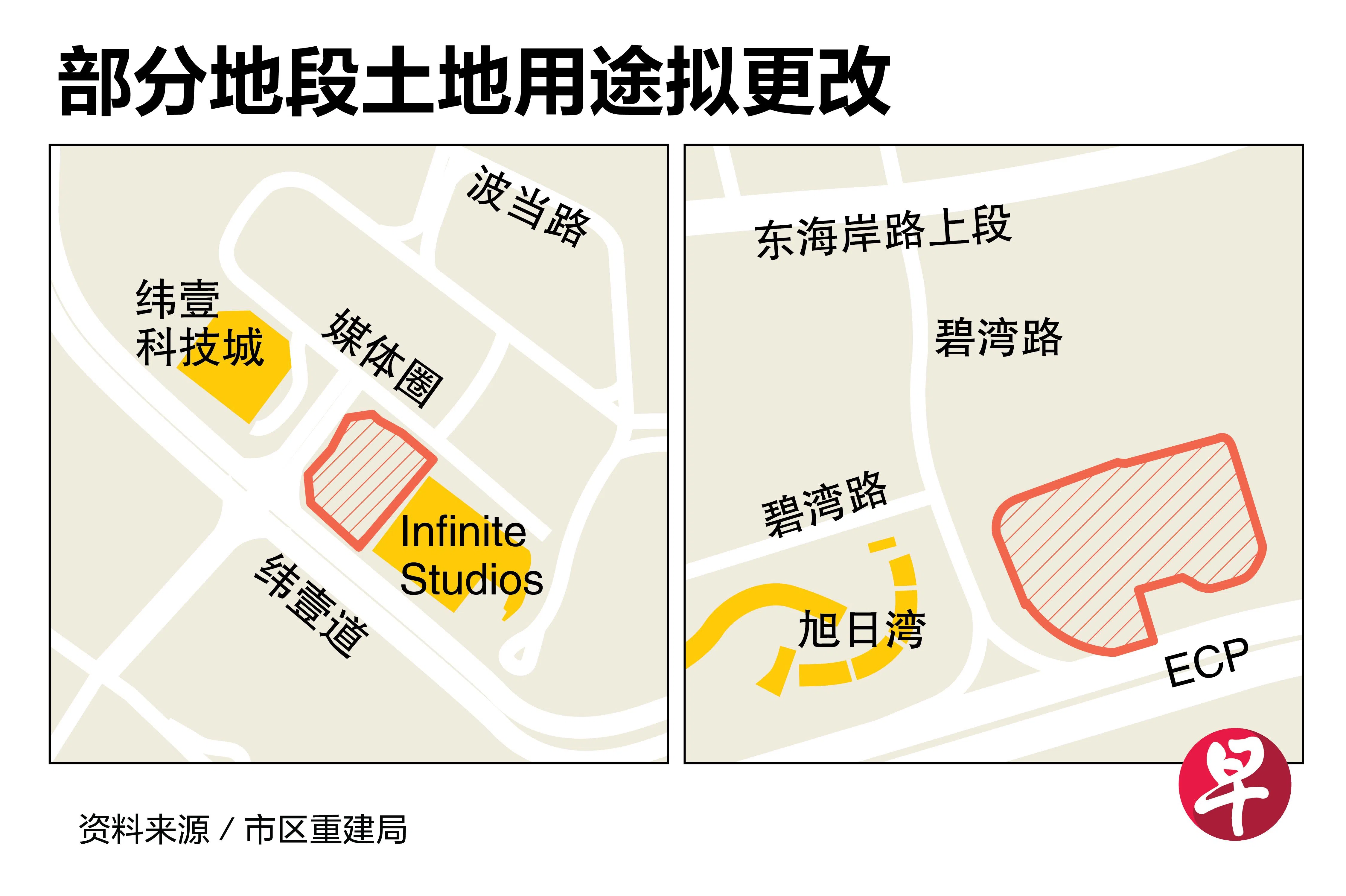 市建局星期五(10月6日)在官网公布,七个地段的土地用途更改的详情。其中,媒体圈(Media Circle)/纬壹道(one-north Avenue)地段从“总容积率(GPR)为3.5的商业园”改为“总容积率为4.2、地面层为商业空间的住宅”。这个“高密度住宅项目”将满足纬壹一带的住房需求,让那里成为“充满活力的综合用途商业园”。