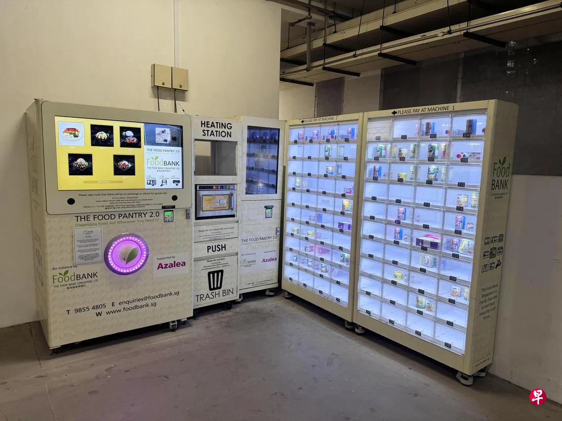 记者走访位于蔡厝港七道第813A座组屋的食物贩卖机时,发现价值3元5角的选项多由两件食品组成,食品种类多样,包括沙丁鱼罐头、饼干、牛奶、快熟面等。贩卖机也接受多种无现金支付方式,包括信用卡和易通卡支付。