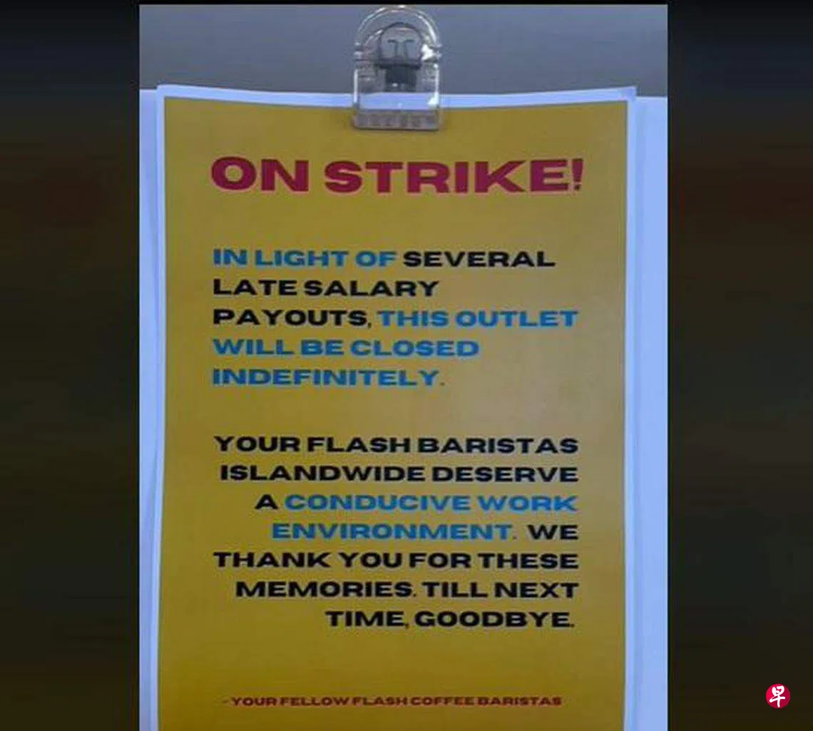 社交媒体平台TikTok星期四(10月12日)疯传一段视频,显示Flash Coffee裕廊坊的分店没营业,店外贴了张告示,写着“鉴于多次延迟支付薪水,此店将无限期关闭”,以及“全岛分店的员工都应在有利的环境中工作”。
