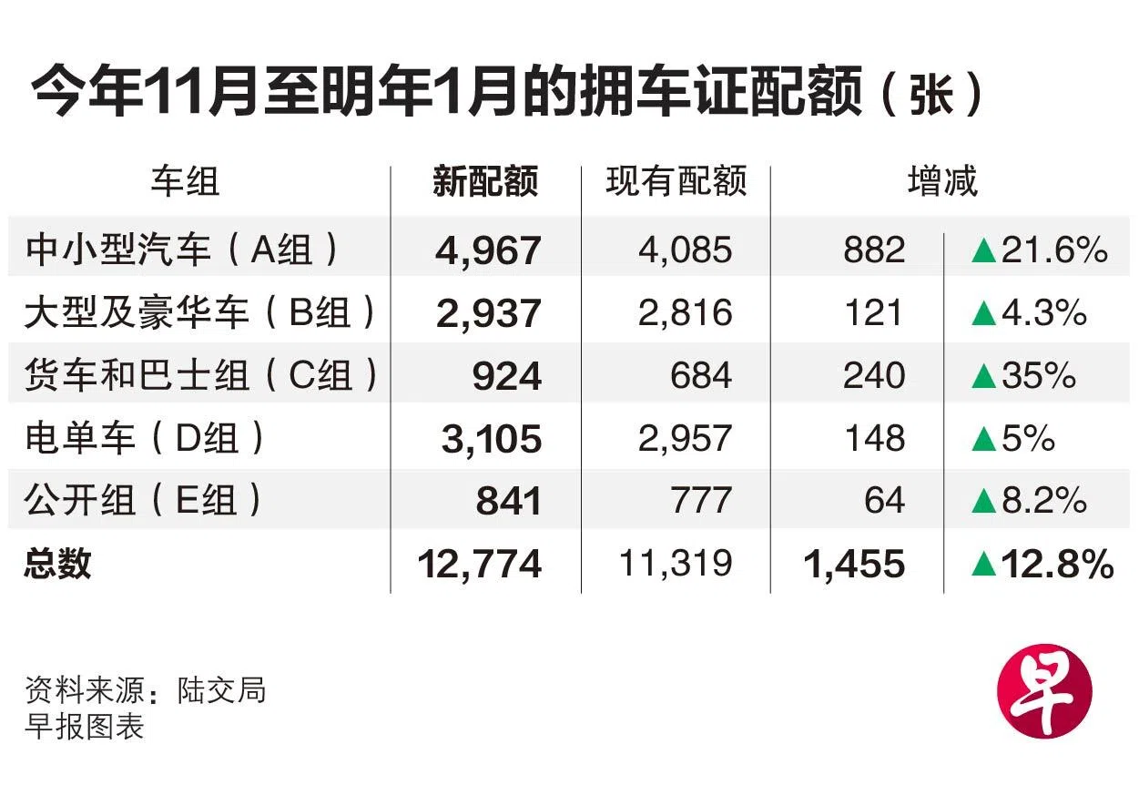 陆路交通管理局星期五(10月13日)公布今年11月至明年1月的拥车证配额,接下来三个月可供投标的拥车证共计1万2774张,比8月至10月多1455张,或近13%。