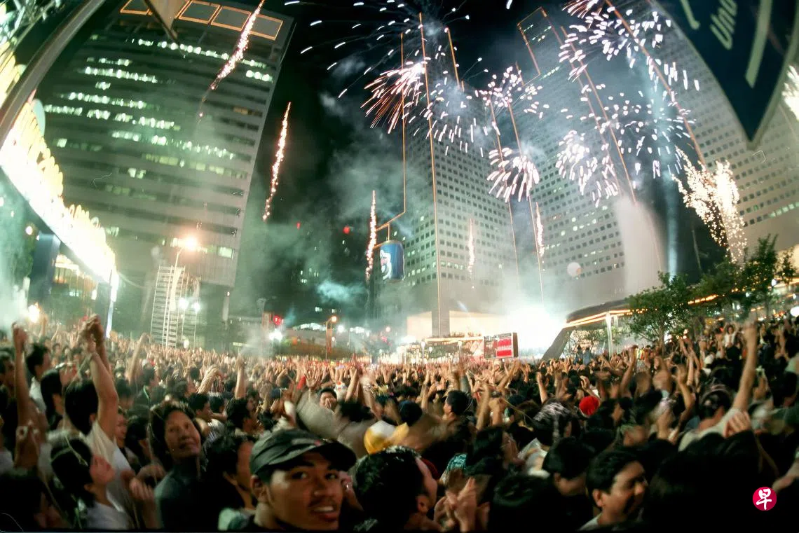 图为当天新加坡广播机构(现新传媒)在新达城举行的露天迪斯科舞会,吸引了成千上万人到场参与倒数迎接千禧年。广播员带领大家载歌载舞,现场乐声不间断,人声沸腾。