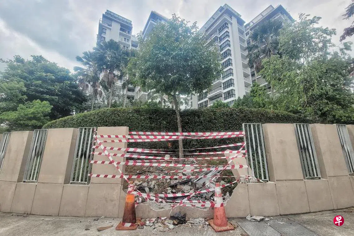 记者星期天(16日)走访现场时,损毁的围墙已被封条围起来,附近还残留下轿车的零件以及围墙剥落下的碎片和小石头。