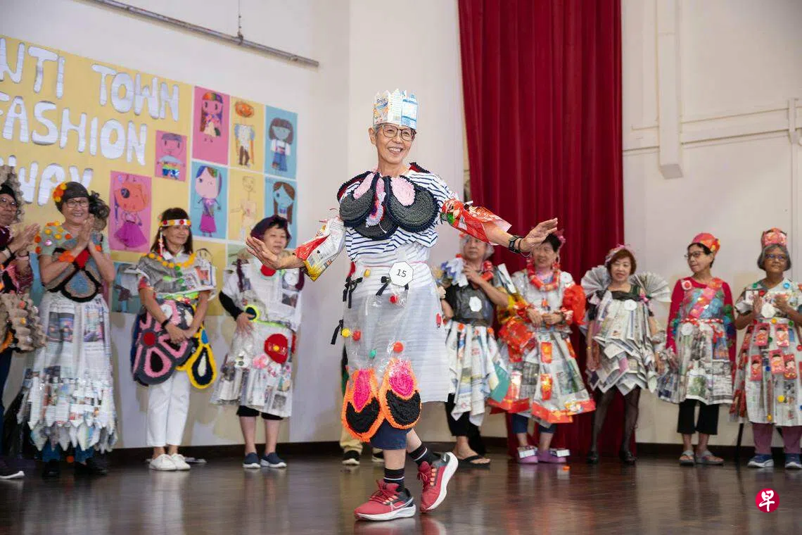活动上,年长者组成四人小组,发挥团队创意利用可回收材料制作新服装,之后派出一个代表在台上走秀。