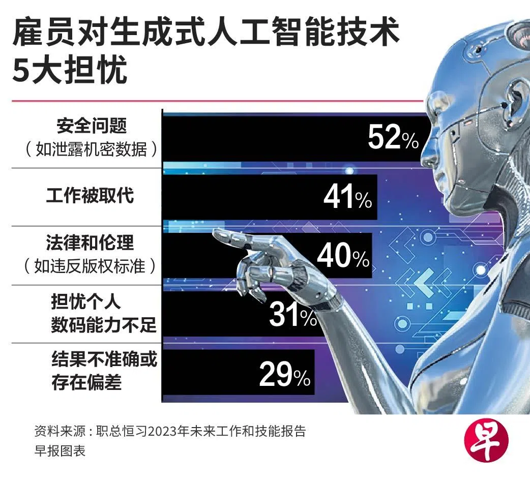 虽然AI有助提高工作效率和生产力,但受访雇员也表达对这类新兴科技的担忧,其中超过一半担心安全问题,如泄露机密数据,有41%雇员害怕工作被取代,其余则关注法律和伦理问题(40%)、担忧个人数码能力不足(31%)及生成式AI结果不准确或存在偏差(29%)。