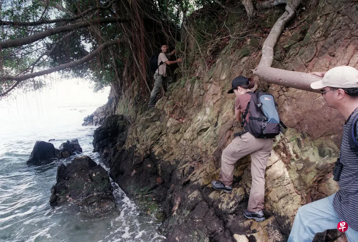 图片是《联合早报》记者和研究小组当年在拉扎鲁斯岛南边海滩进行实地探险时,攀爬岩壁的一幕。由于涨潮,原本可以通行的海滩没了去路,只能踩在长满青苔、湿滑的陡峭石头上,一步步谋定而动,相当惊险。