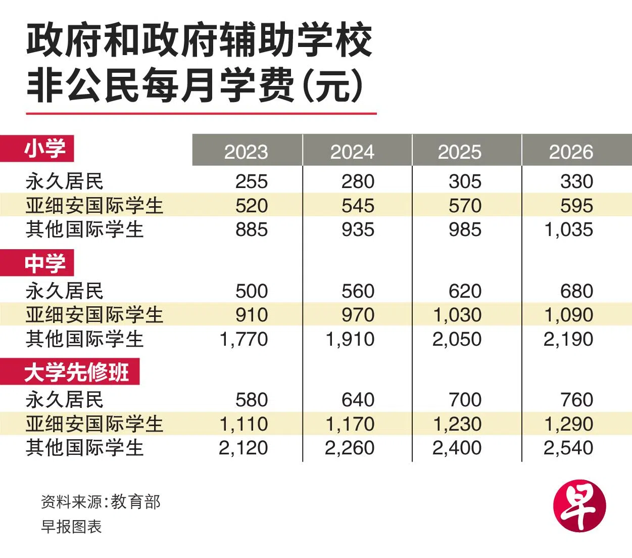 这一学费调整将连续三年逐年增长。以小学为例,2024学年永久居民学生的每月学费将从今年的255元涨至280元,2025学年升至305元,2026学年则进一步上调为330元。