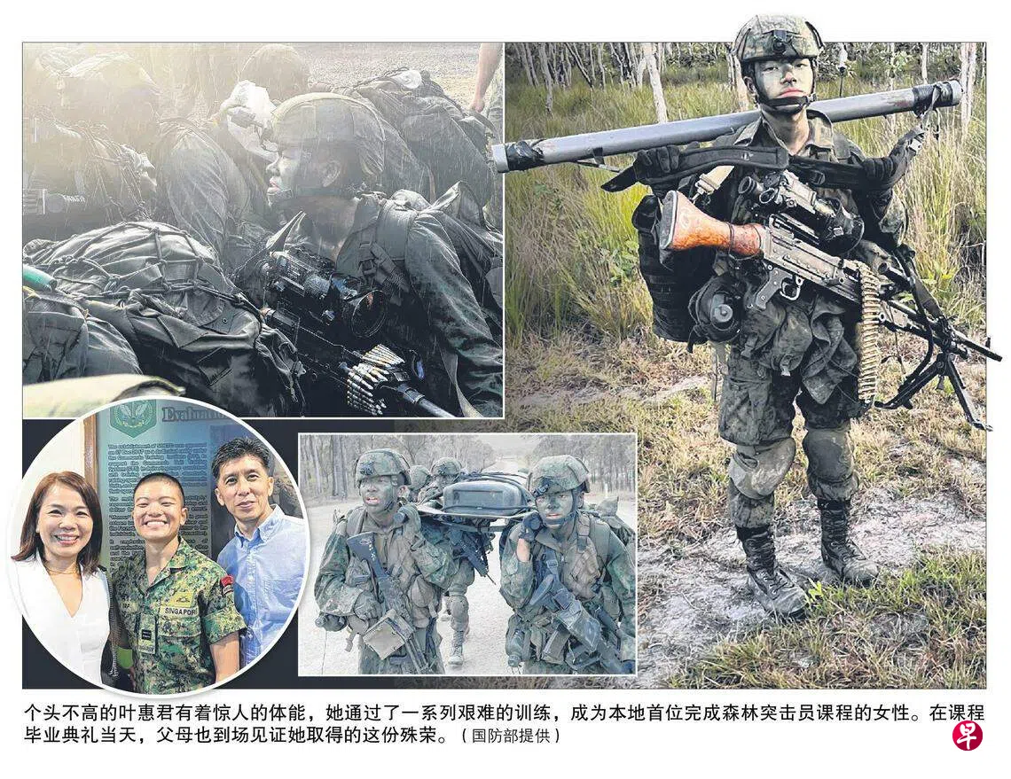 为挑战自我极限和踏上一趟自我探索的路程,今年27岁的叶惠君参加了被视作新加坡武装部队最具挑战的森林突击员课程(Ranger Course),是本地首个完成课程的女性。65天的训练分三个阶段进行,包括战略策划、武器练习,以及海域和空中战技等各种项目,对体能和心理素质的要求极高。