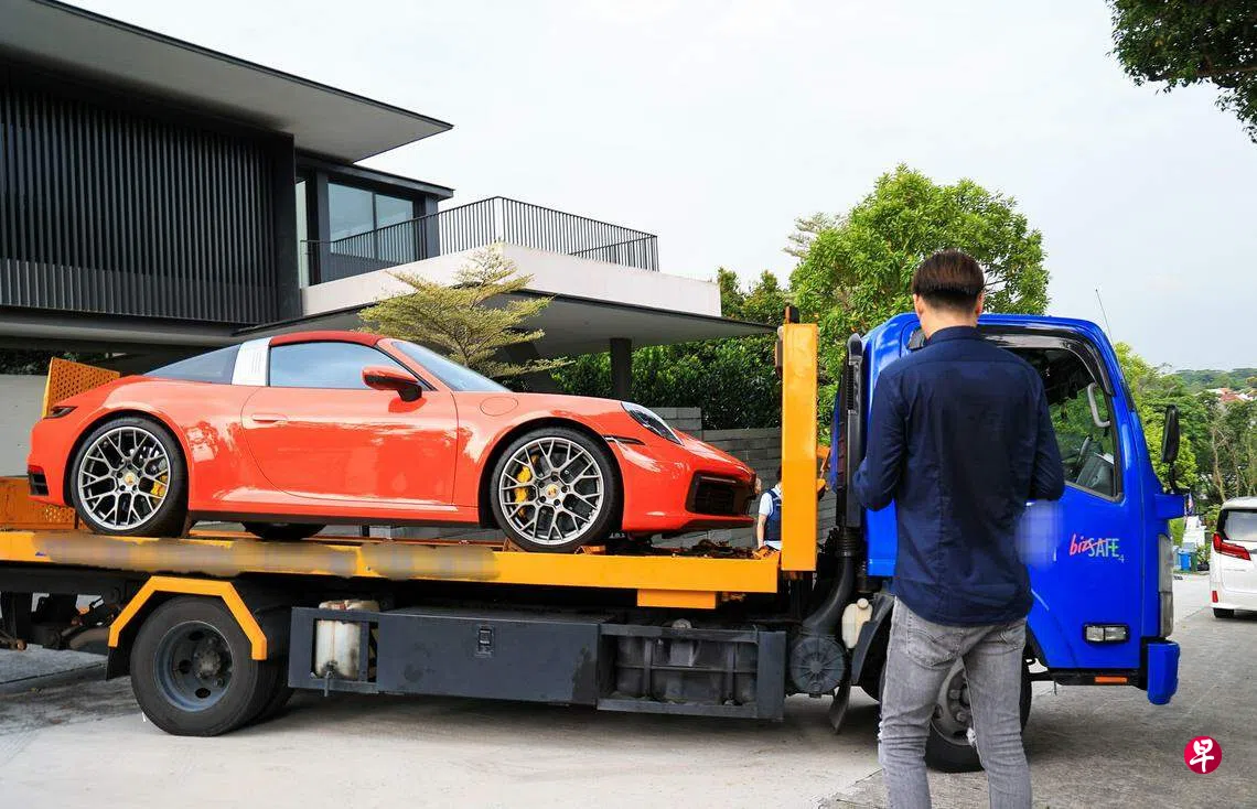 10名涉案被告之一的苏剑锋(35岁)早前在武吉知马3道租住的优质洋房内被捕,警方星期三(10月25日)下午2时30分再次上门,用拖车将他名下的四辆豪华车子拖走。