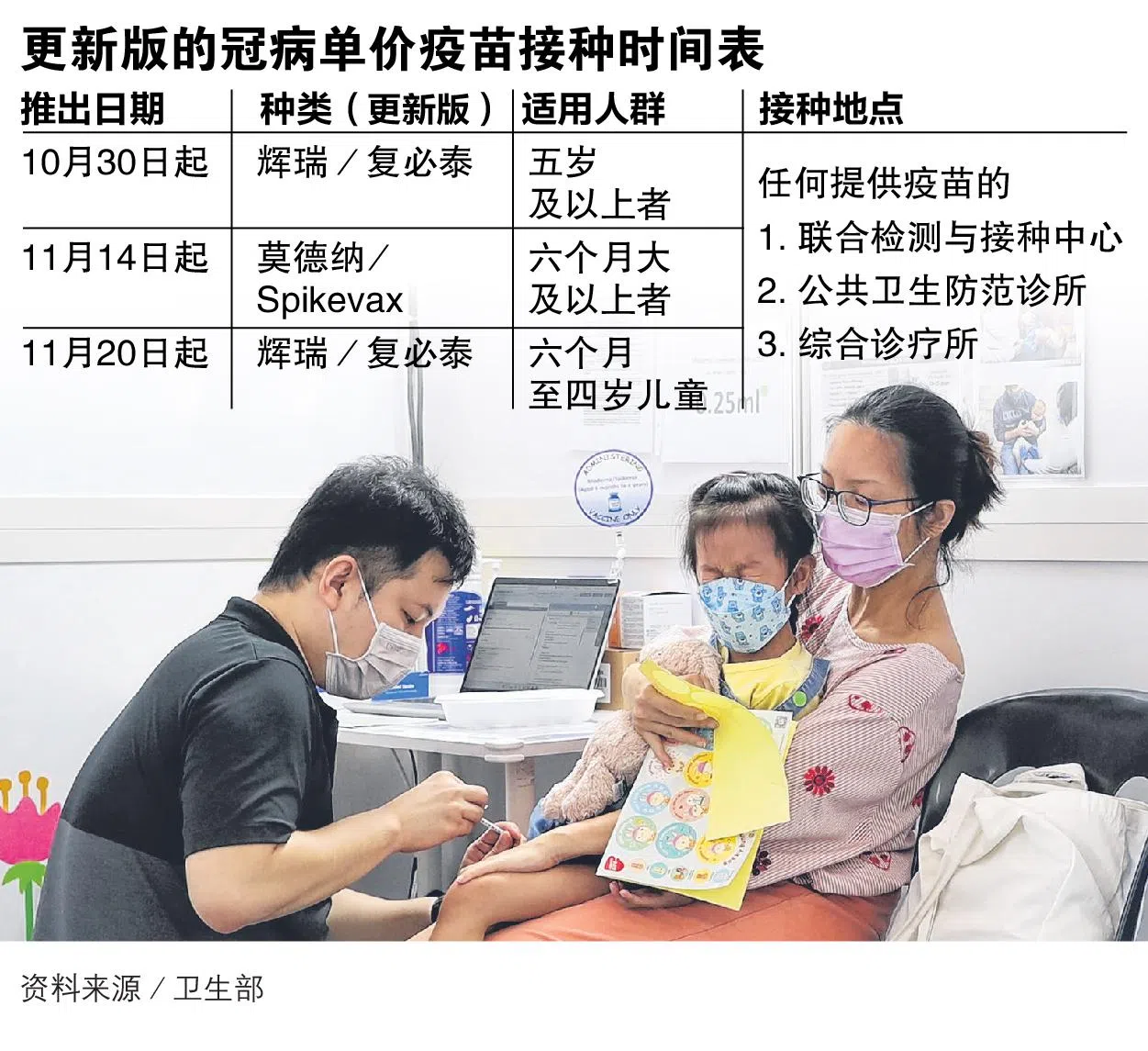 根据疫苗运抵日期,卫生部除了推出上述两种更新版疫苗外,也将在11月20日起推出适用于六个月至四岁儿童的更新版辉瑞/复必泰单价疫苗。