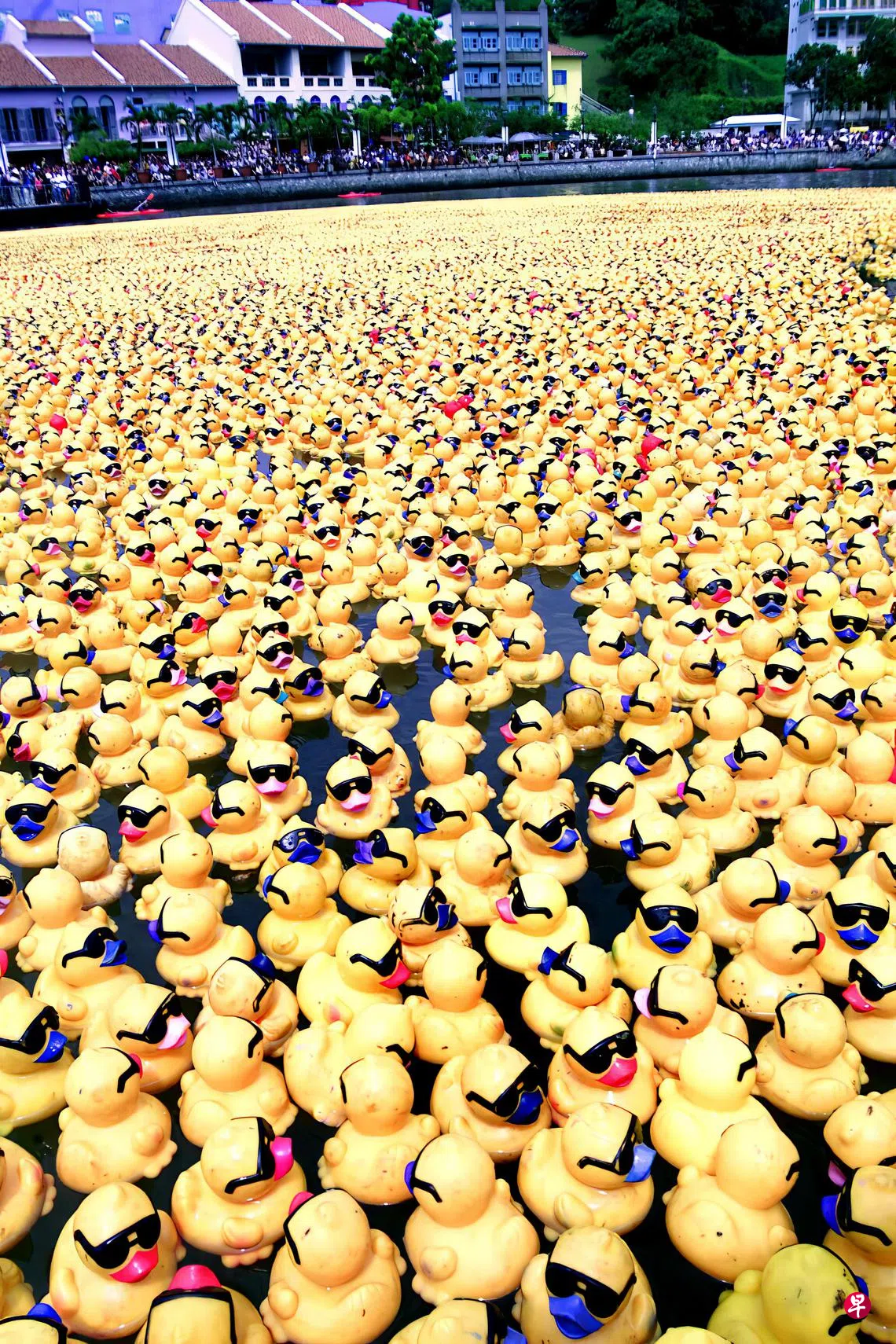比赛当天,这10万只塑胶鸭子在新加坡河上竞速,看谁最先抵达终点。最终,编号“082785”的小黄鸭成了冠军,领养人也获得1万元。