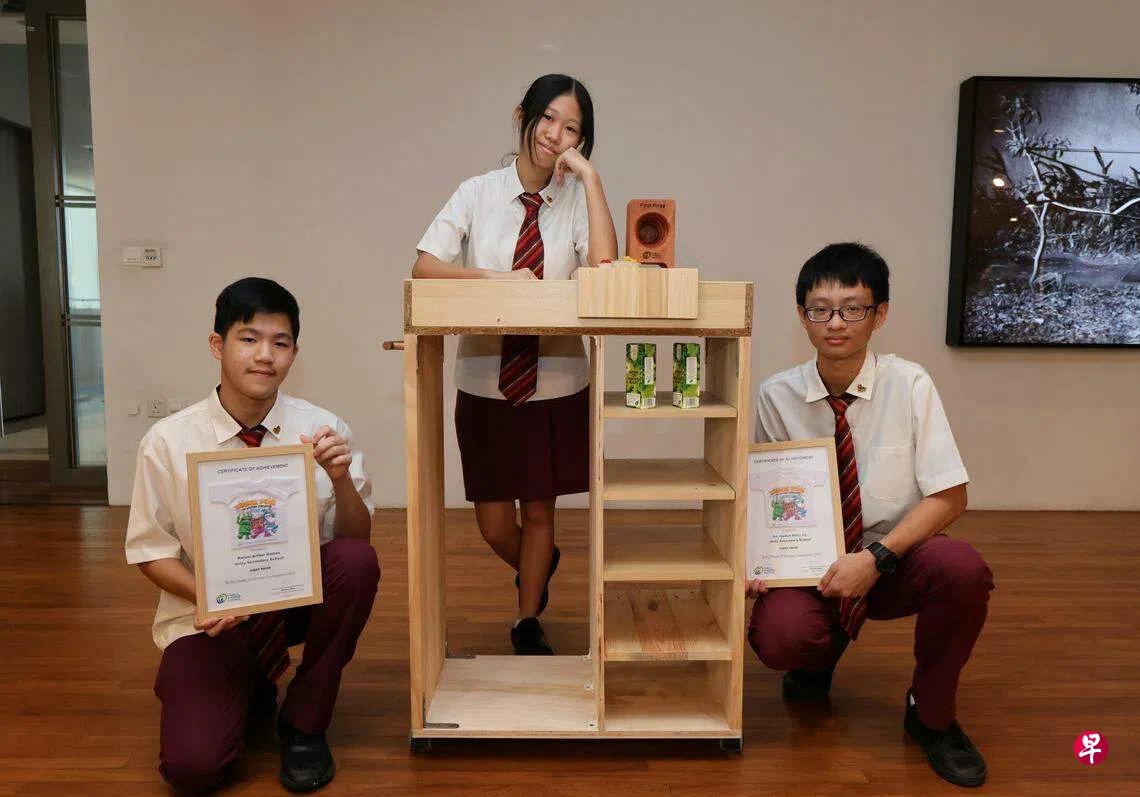 “变废为宝”竞赛由新加坡公共卫生理事会主办,旨在激发青少年的创造力和想象力,将要废弃的大件家具重新设计和改造成有用的物品。