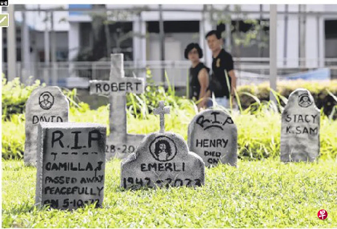 为庆祝万圣节,居民自掏腰包,花400元购买材料自制墓碑,在组屋楼下草地打造“墓园”,有居民被吓坏,有人觉得有创意。