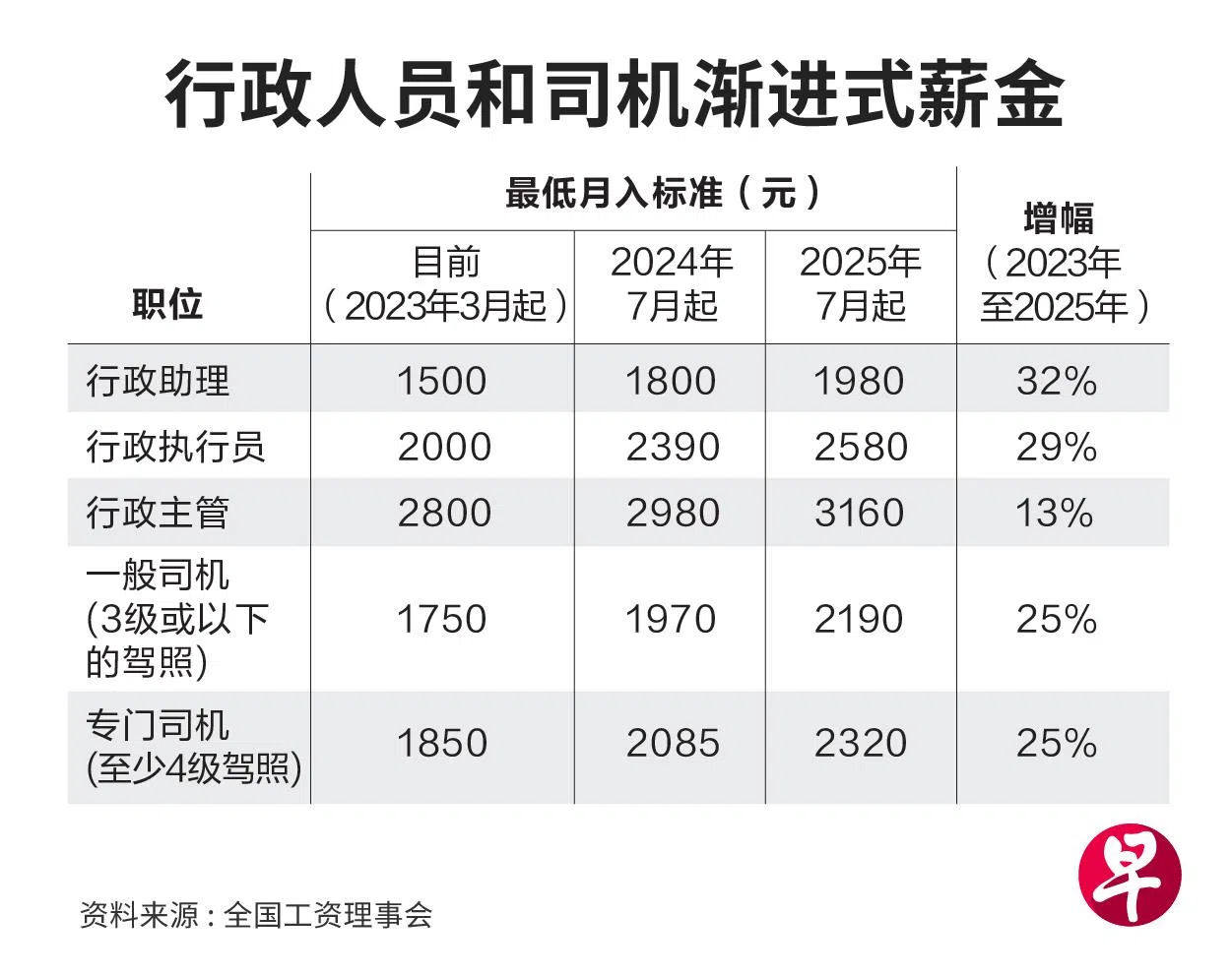 驾驶大型车辆如巴士、罗厘等的司机以及私人司机这类专门司机,目前的月入最低为1850元,从2024年7月起将提高到2085元,并在2025年7月增加到2320元。政府将继续通过渐进式加薪补贴计划,为雇主承担部分加薪额。
