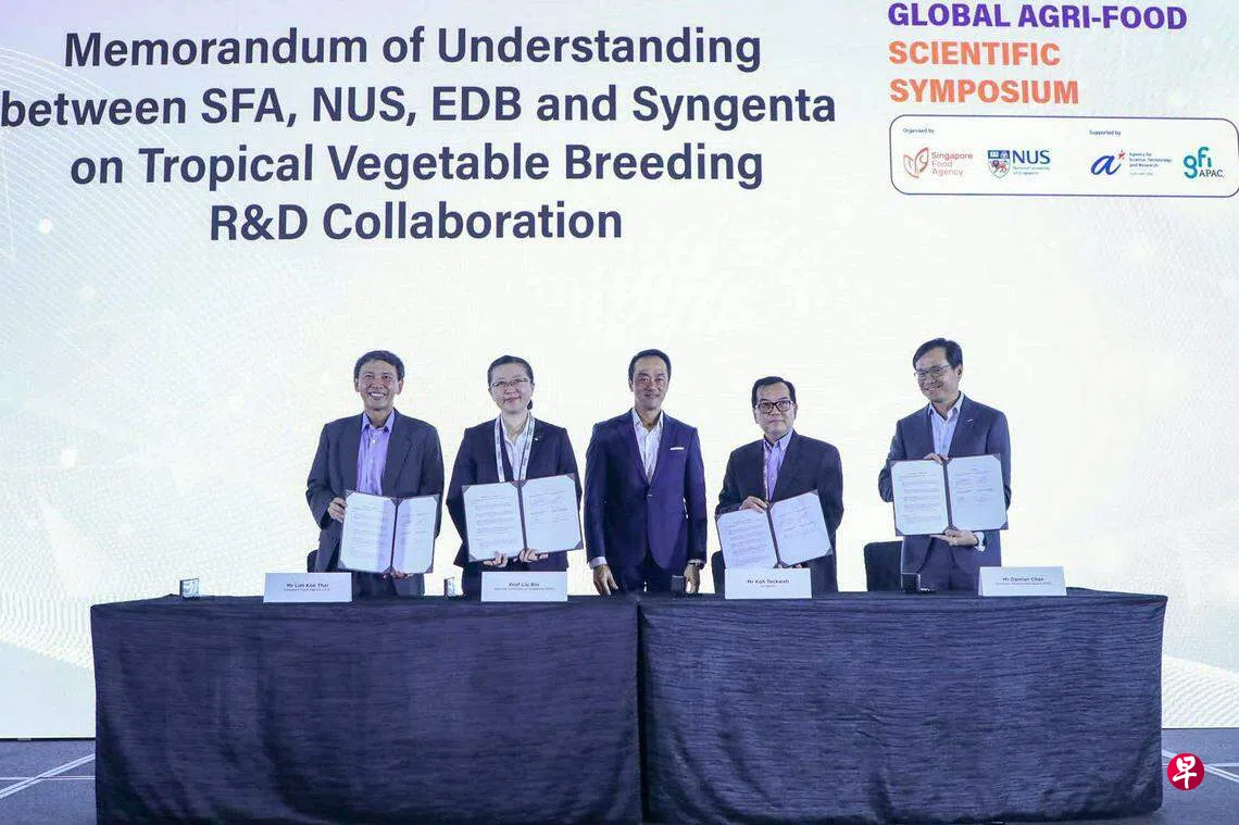 另一方面,食品局、新加坡国立大学和经济发展局,星期三与农业科技企业先正达(Syngenta)签署谅解备忘录,合作研发可以提升农产效率的蔬菜品种。这项合作旨在激发热带蔬菜生产创新,同时加强我国粮食安全。