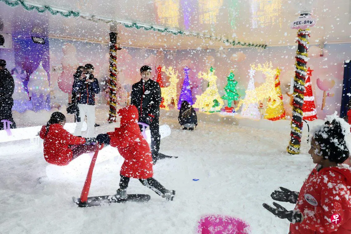 来到T3抵境厅外的“糖果冰雪世界”,公众可以先换上冬日外套和鞋子等装备,进入到零下10度的室内雪地,坐上雪橇车,与驯鹿冰雕合影,还可以参与迷你篮球、迷你保龄球、迷你高尔夫球和迷你跷跷板等活动。