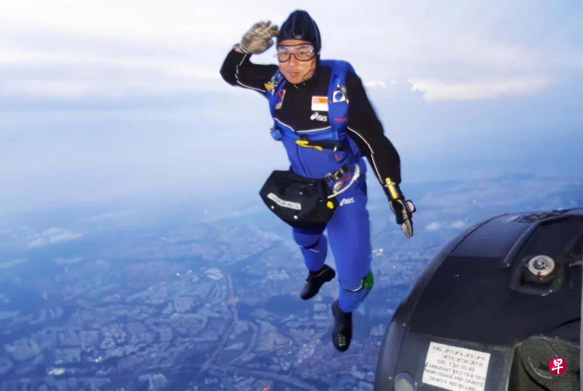 在每一年国庆庆典的跳伞表演中,观众总会看到跳伞员从天而降、准确落地的一幕。2001年,为了给读者增添新鲜感,《联合早报》当时的摄影记者何炳耀换了个角度,从直升机捕捉跳伞员在1500公尺高空上,纵身跳出机外的精彩刹那。