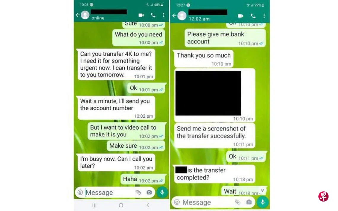 警方说,这类骗子会通过入侵WhatsApp户头,假冒用户,联系通讯录中用户的家人或朋友,以急需支付紧急医疗费等理由向他们借钱。这些骗子往往声称银行户头受到限制,要求用户的亲友把钱转到另一个户头或者PayNow某个号码,借此骗走他们的钱。