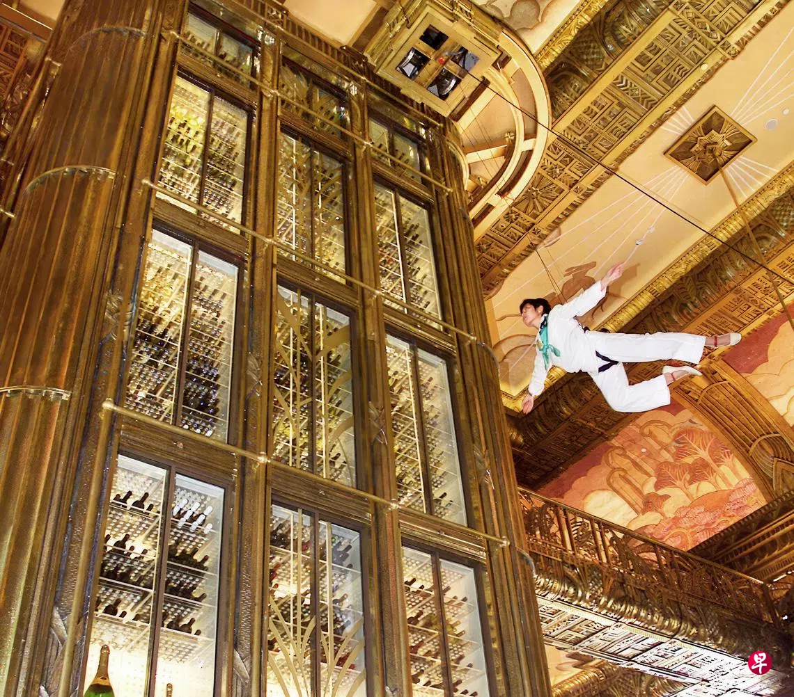 侨福广场大厅内有一座12公尺高、5公尺宽的三面酒塔。如果要拿酒,工作人员必须由电缆吊到半空中。