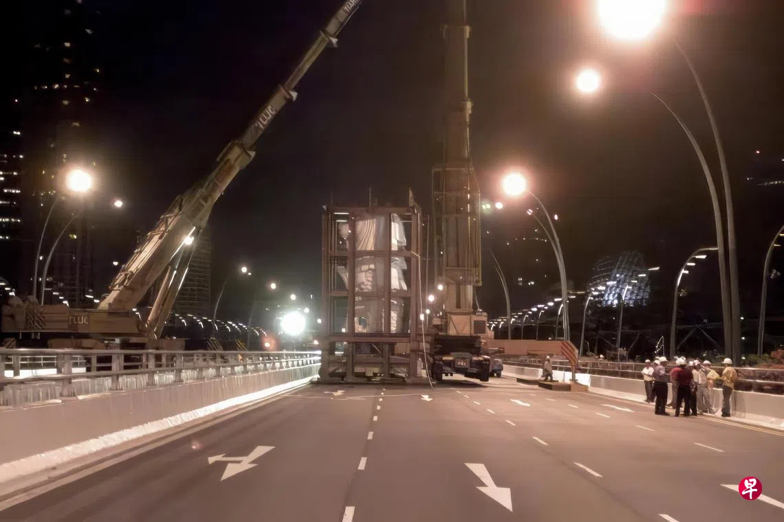 将重达70公吨的鱼尾狮从滨海湾桥一侧搬到另一侧,不是容易的事。鱼尾狮先被起重机吊起,慢慢放在桥面上,再由第二辆巨型起重机接力,从另一侧吊下桥。搬迁进行时,这难得一见的场面引来许多人驻足观看,甚至在凌晨时分竞相围观。