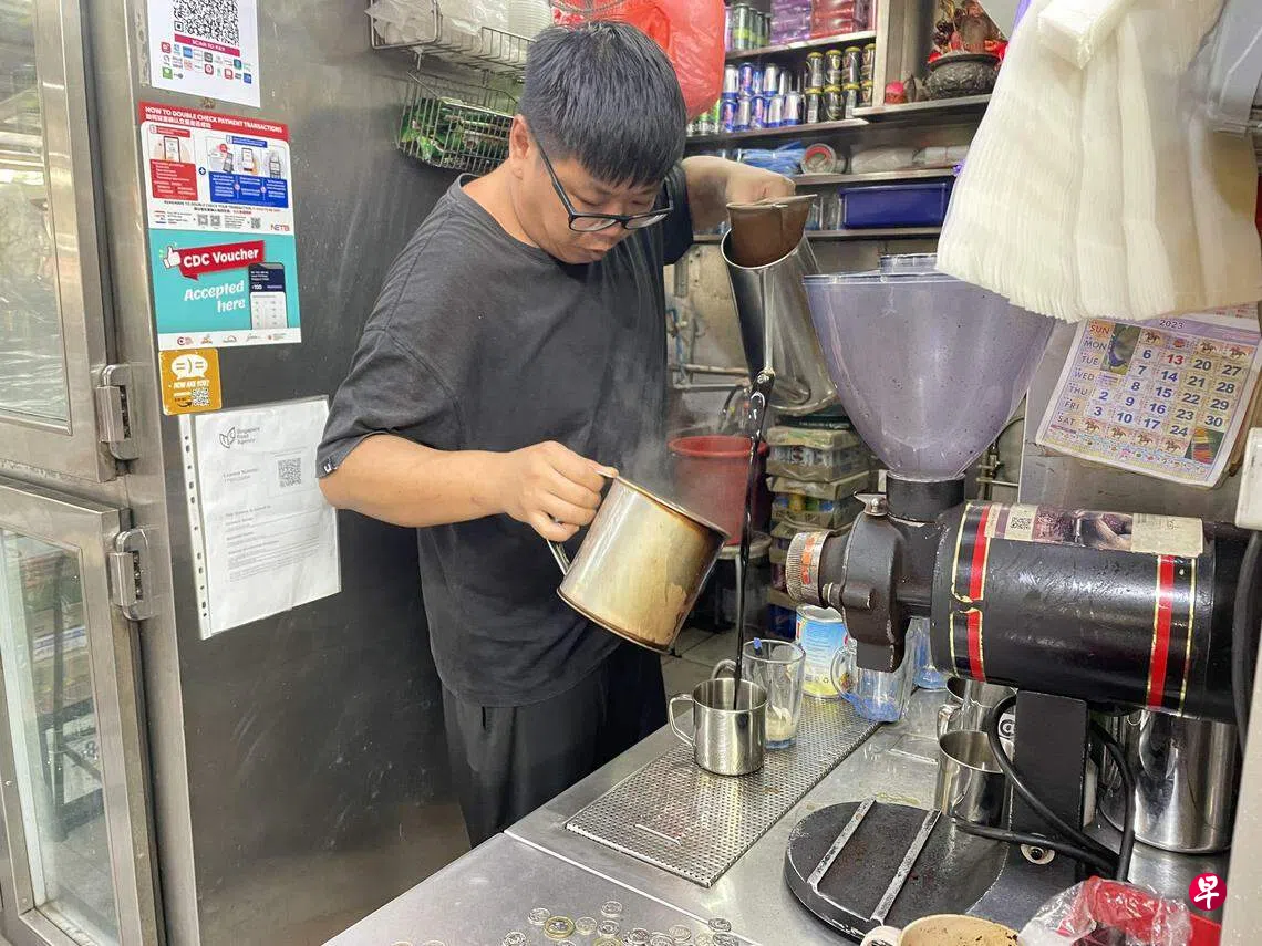 黄心伟16岁就入行学泡传统咖啡和茶。他说,这是家族生意,从爷爷的年代开始。父亲和其中两个姑姑都经营茶水摊。他最初是向姑姑学习手艺。