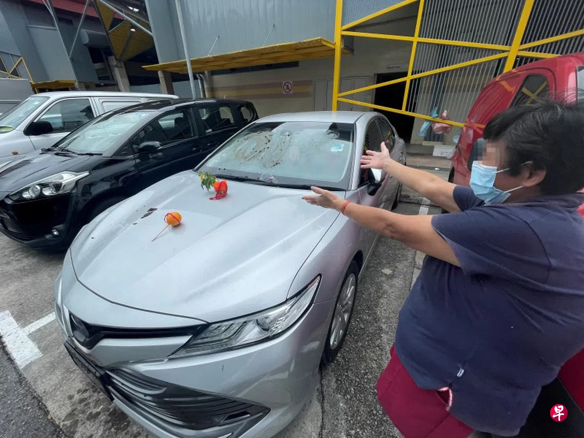 热心读者星期天通知《新明日报》,指阿裕尼沈氏坊第49座巴刹和熟食中心停车场的一辆轿车,不知何故被人恶意破坏,不仅车头上摆放着祭祀物品,车身四周更涂抹了粪便。