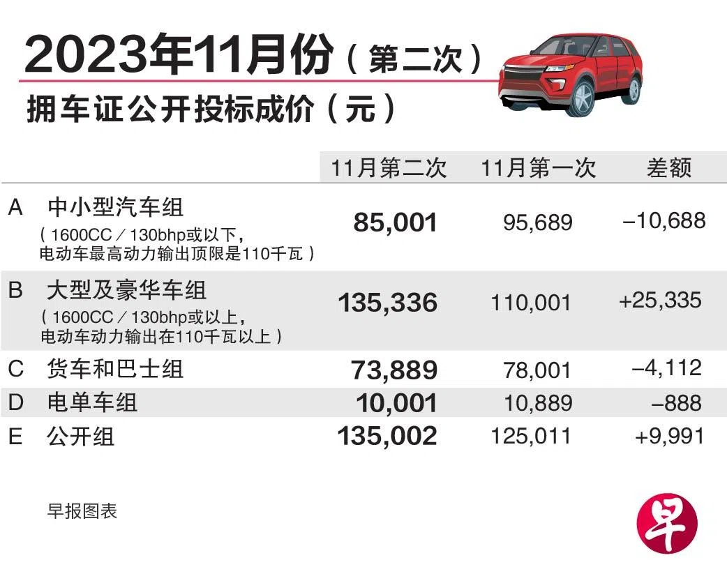 11月第二轮拥车证公开投标活动星期三(11月22日)下午结束,大型及豪华车组(B组)成价回升,比上一轮的11万零1元,高出2万5335元(23%),报13万5336元。