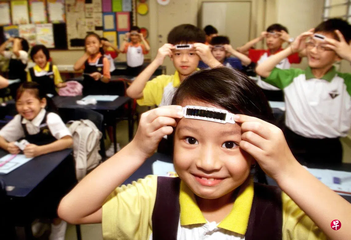 教育部于2003年5月分发探温贴条(fever strip thermometer )给大约10万名小一和小二的学生。图为南山小学的学生,在收到探温贴条后齐齐量体温。