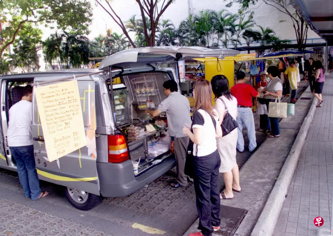 2003年,市区重建局发出33张经营执照,允许快餐车开入市区停车场售卖早餐。两个月后,就有三分之一执照持有人放弃经营。图为乌节索美塞地铁站外露天停车场的快餐车,生意还过得去。