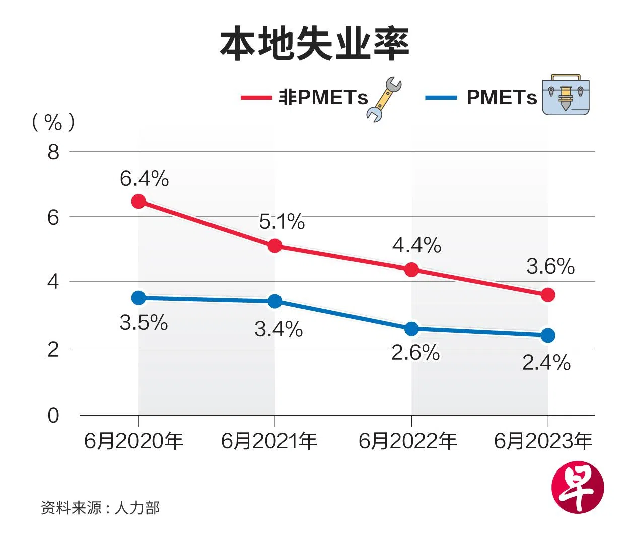 专业人士、经理、执行员与技师(PMET)和非PMET的失业率和长期失业率,今年均有改善。其中,PMET失业率从去年的2.6%,降至今年的2.4%;非PMET失业率,则从去年的4.4%,减至今年的3.6%。PMET长期失业率也从0.5%降至0.4%,非PMET则从0.7%降至0.5%。