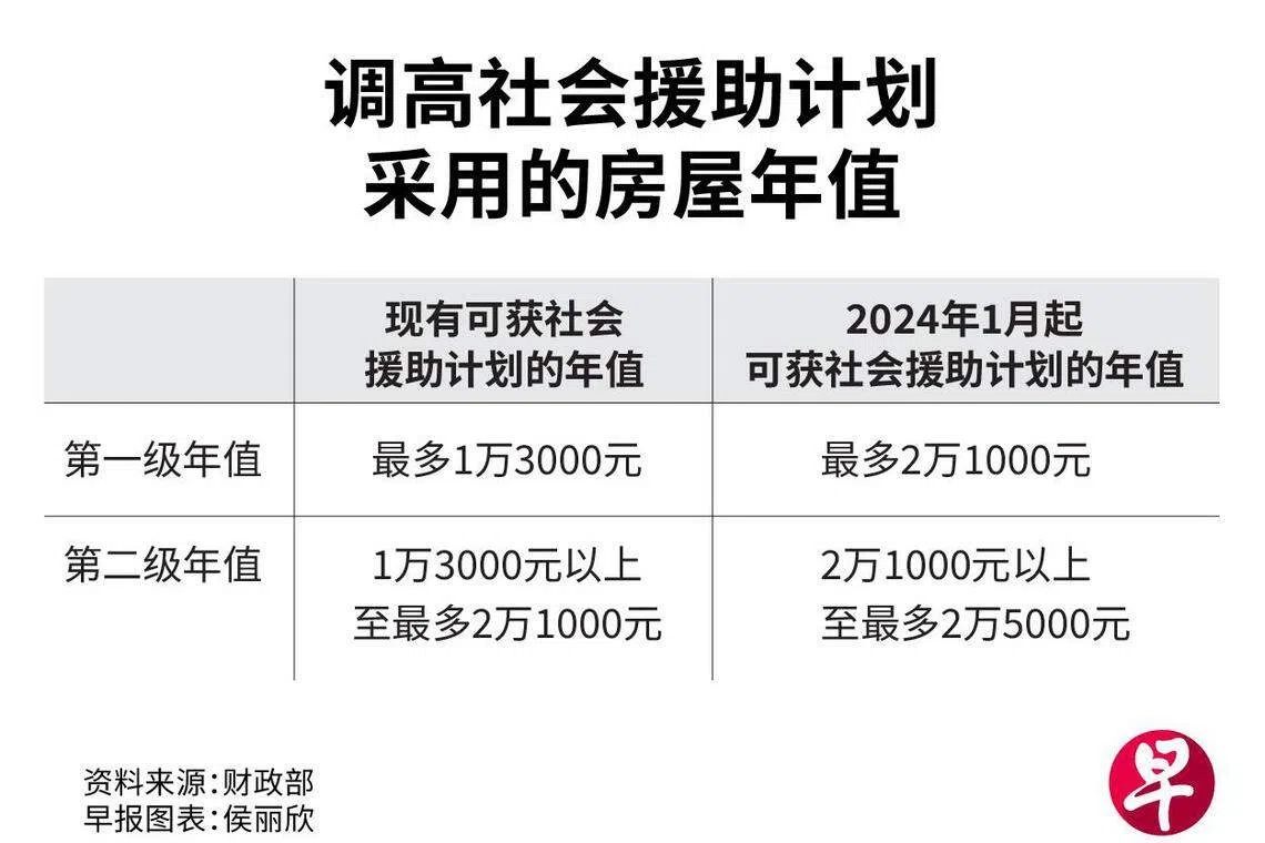 为确保有更大需求的国人继续获得援助,政府也将提高社会援助计划中采用的房屋年值顶限,自2024年1月1日起生效。