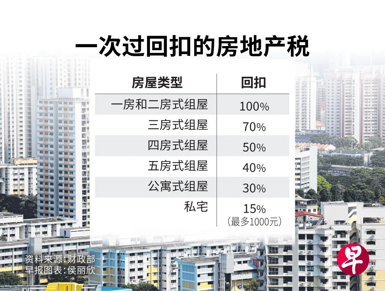有了这笔一次过回扣,所有一房和二房式组屋屋主,明年依然无须缴付房地产税。