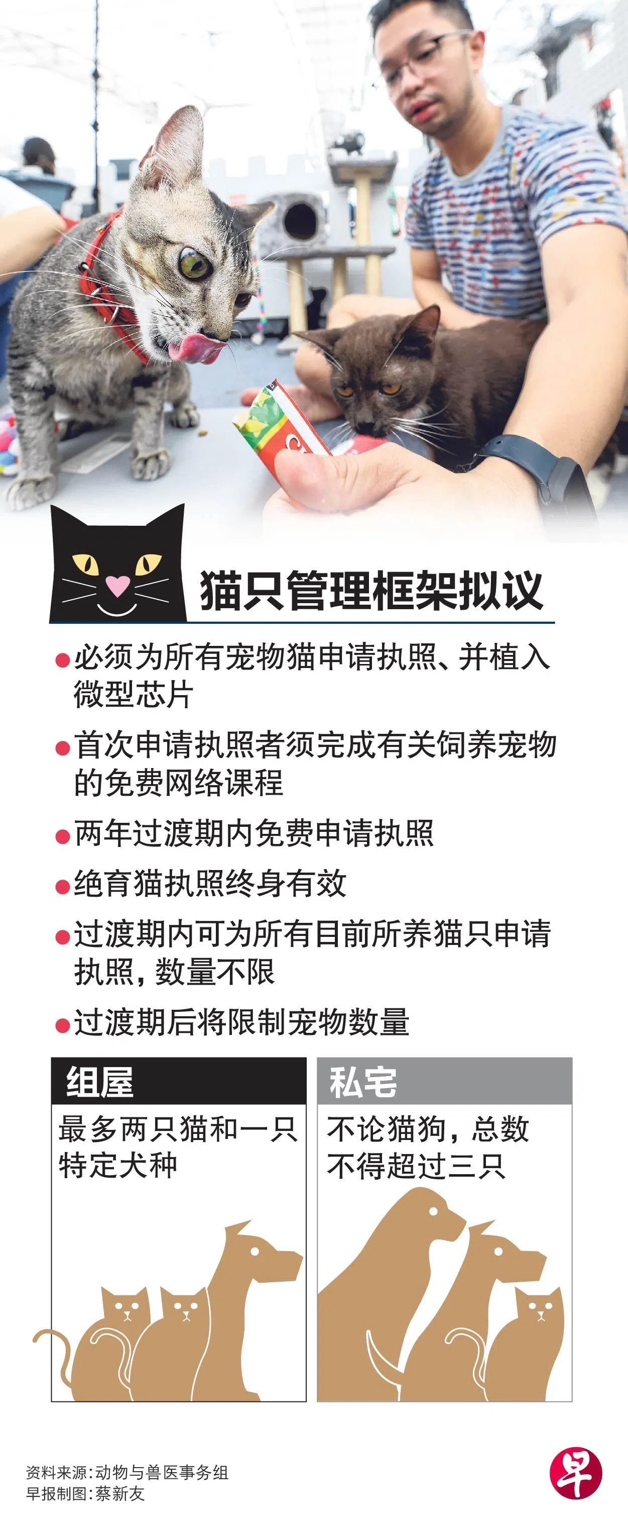 过渡期后,组屋家庭每户最多饲养两只猫和一只特定犬种;私宅住户则最多饲养总共三只猫或狗。过渡期结束后仍继续饲养“无照”宠物猫属违例。