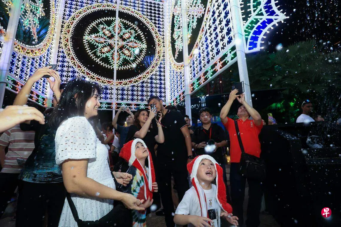 当访客踏入滨海湾花园时,一座高25米、由4万5000个灯泡点缀而成的圣诞树映入眼帘,许多人纷纷在七个五彩斑斓的灯具拱门下漫步。