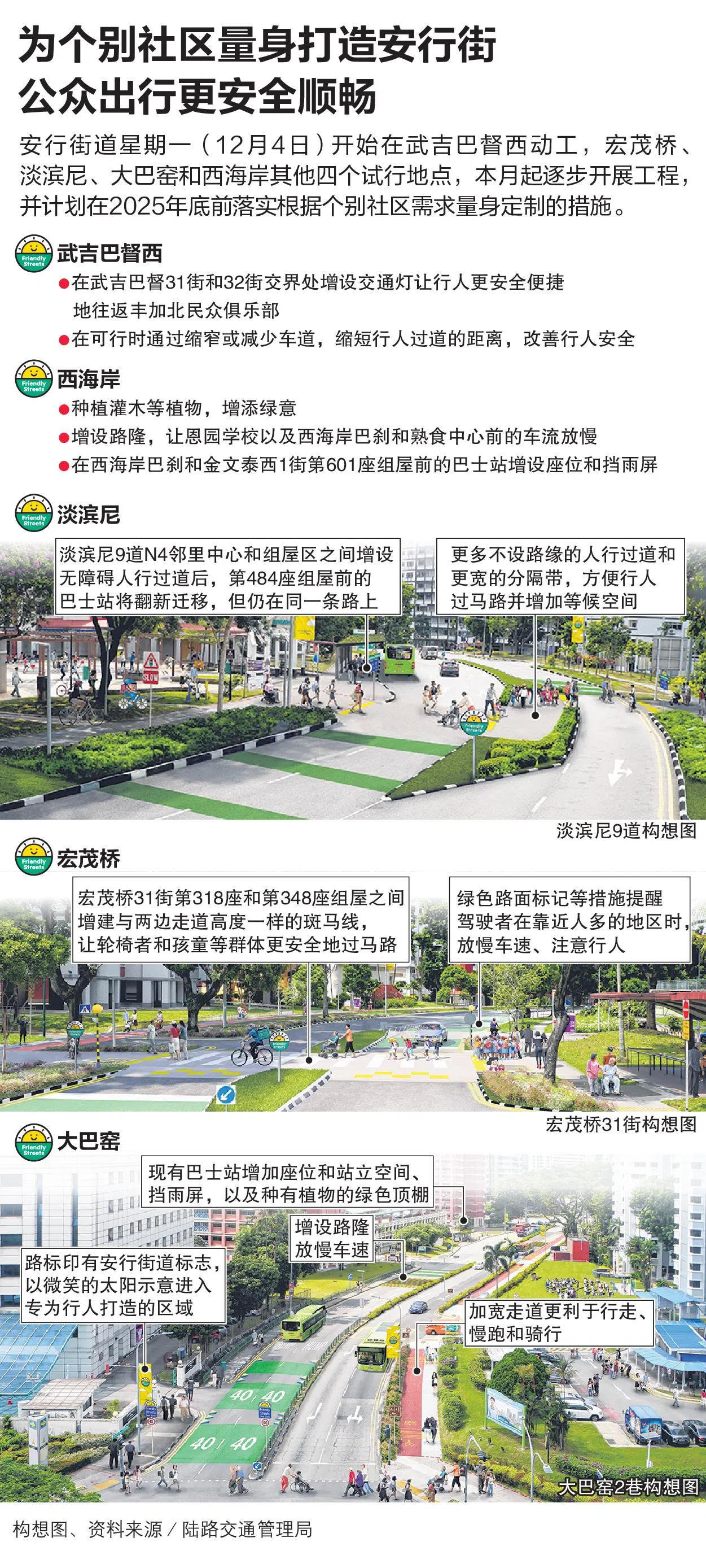 安行街道(Friendly Streets)的五个试行地点为:武吉巴督西、宏茂桥、淡滨尼、大巴窑和西海岸。所有工程预计在2025年底前完成。