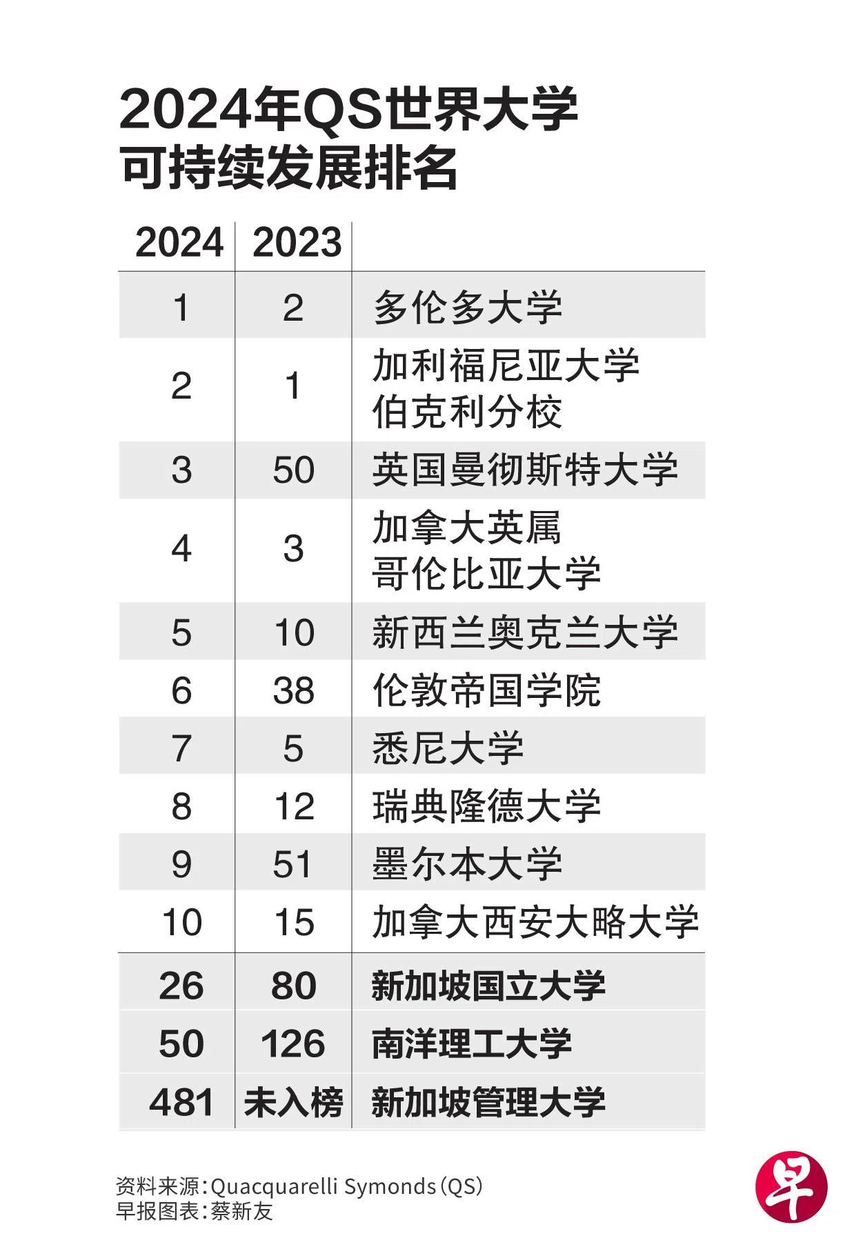 新加坡国立大学和南洋理工大学,在新出炉的2024年QS世界大学可持续发展排名中,首次进入前50,分别位列第26和第50名。新加坡管理大学也首次入榜。