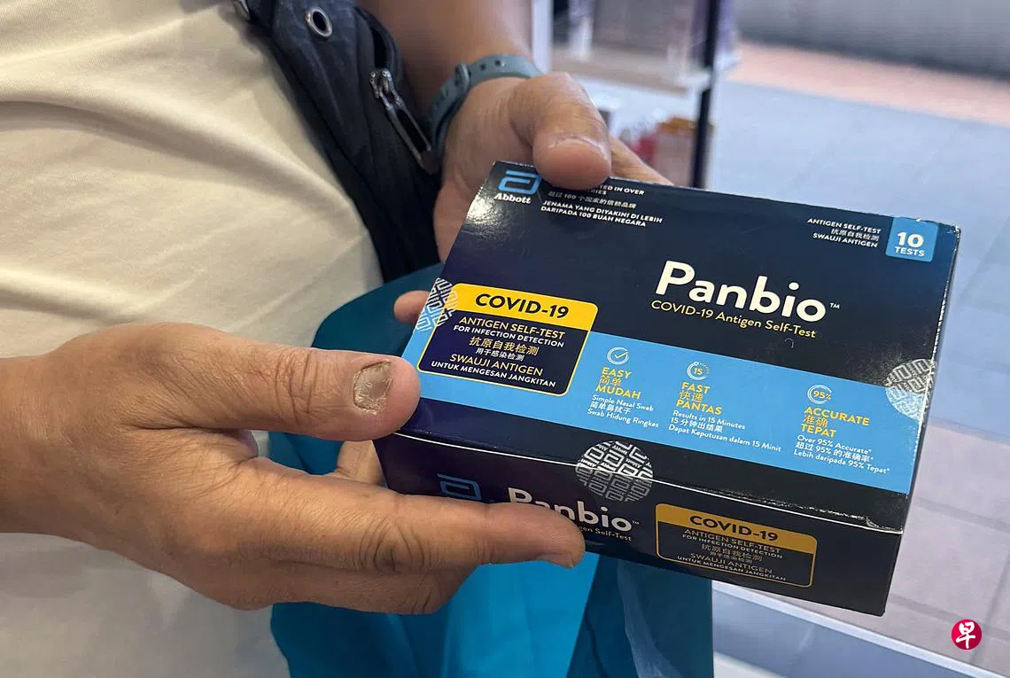 公众朱马特(Jumat,57岁)刚刚两周前第三度确诊冠病,他透露庆幸这回症状不严重但为了家人健康,近日跑遍了附近便利店等都买不到自助检测仪,今早才终于在一家刚补货的药房买到。