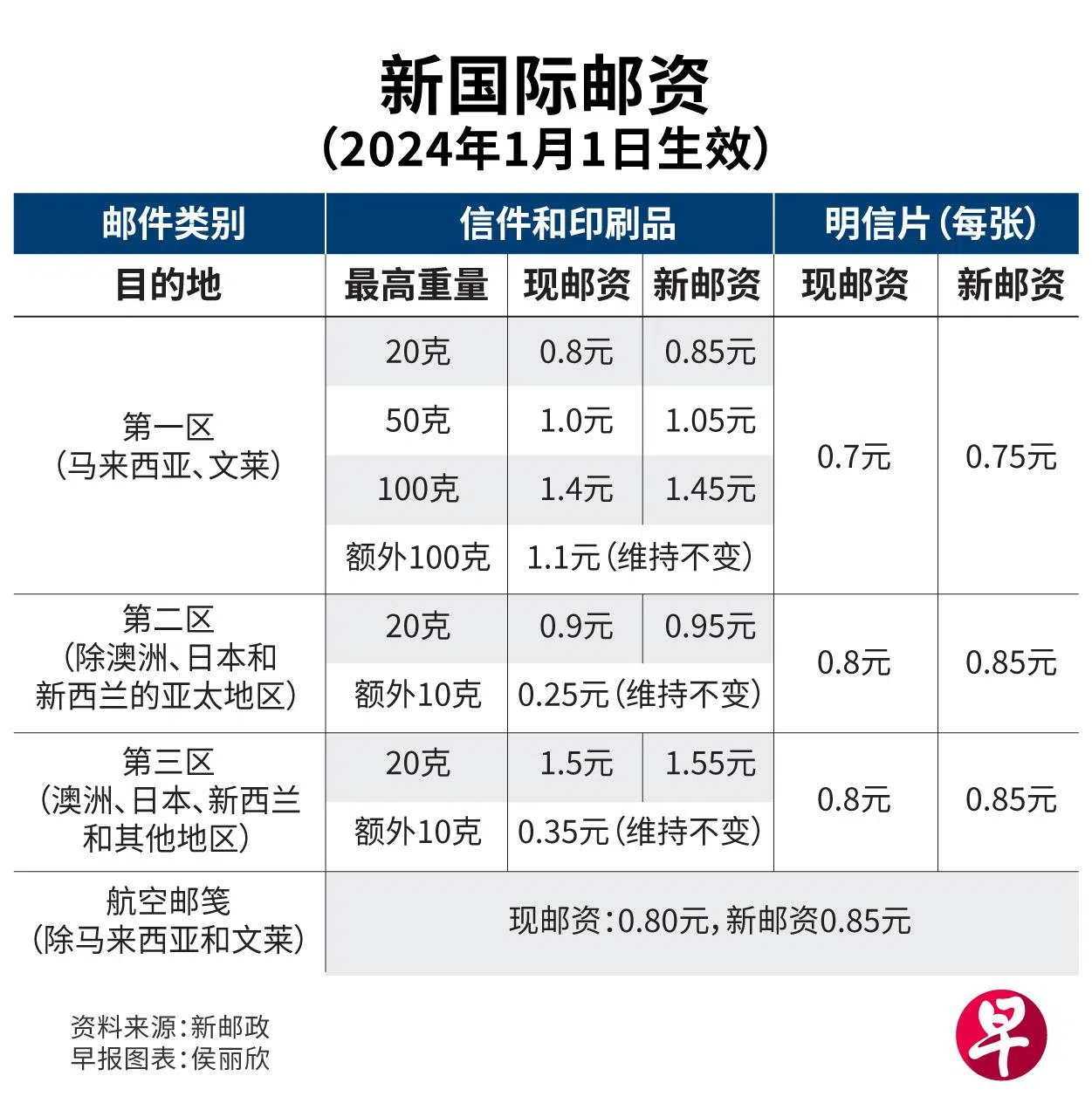 新邮政从2024年1月1日起调高国际邮资,多数类别的国际邮件的资费将上调5分。