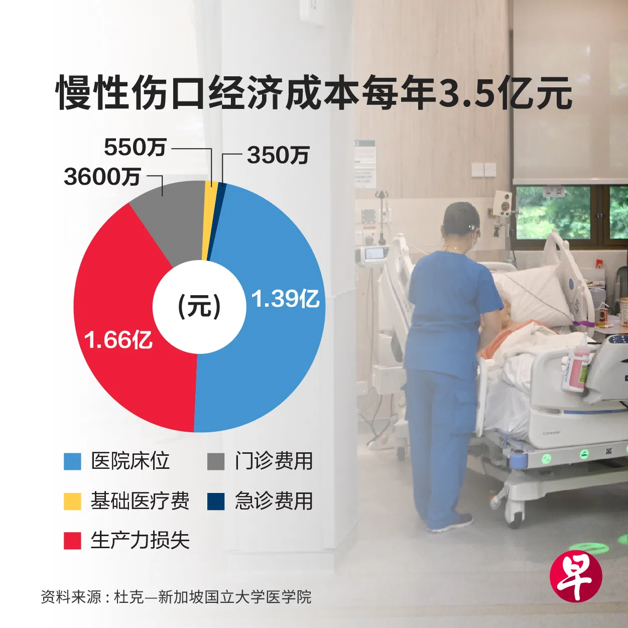 根据杜克—新加坡国立大学医学院和新加坡科技研究局的研究,在这笔每年3.5亿元的经济成本中,1.66亿元是慢性伤口给患者带来的生产力损失,其余开支包括医院床位费1.39亿元、门诊费3600万元、基础护理费550万元,以及急诊费350万元。