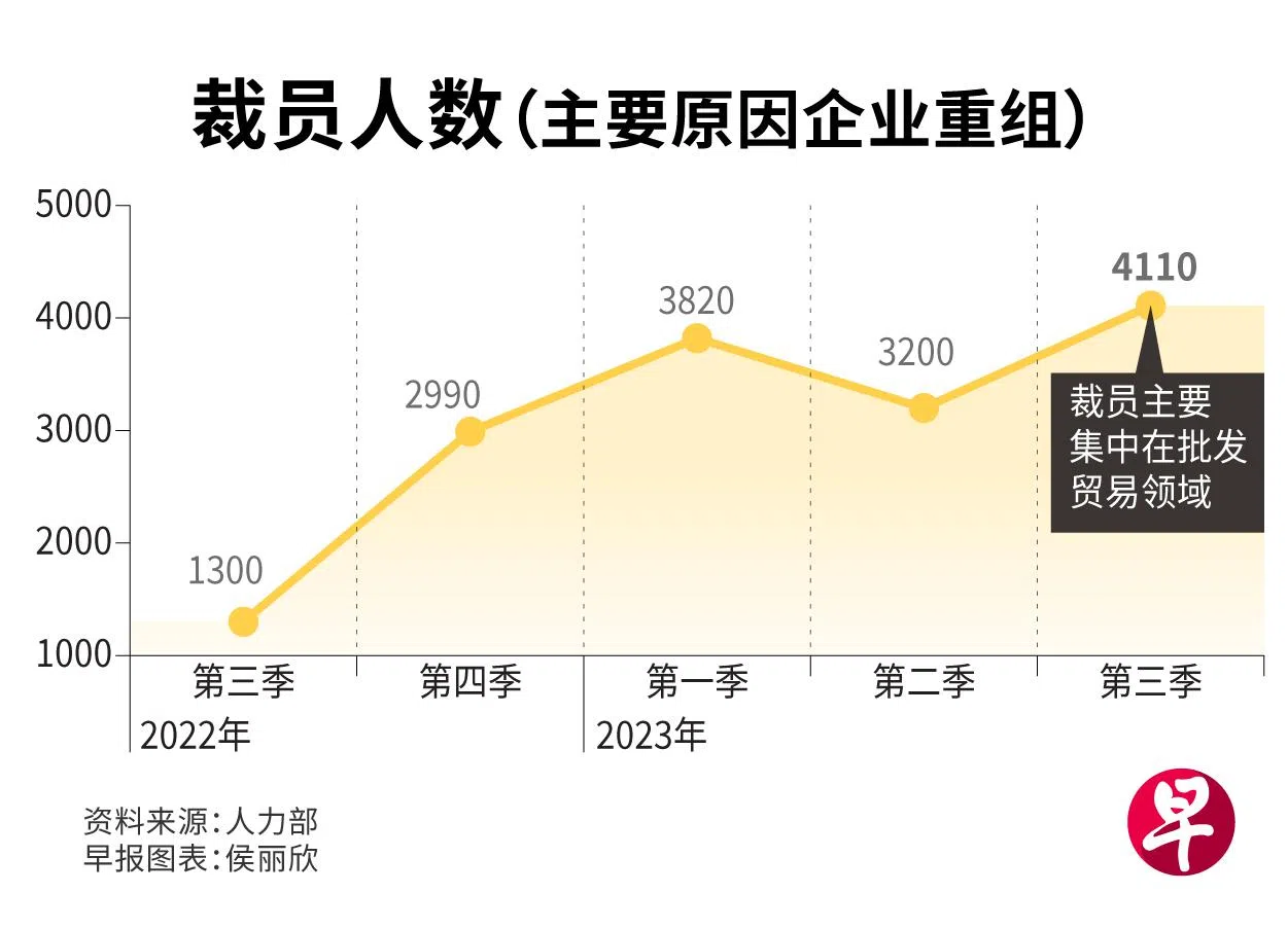 在今年第二季下降之后,本地裁员人数第三季回弹,增加至4110人,环比多了910人。人力部解释,有更多企业重组,或面对业务和成本压力,才会选择裁员。