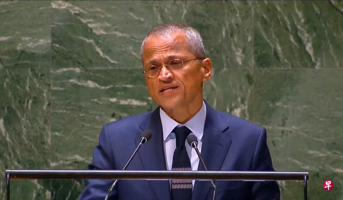 新加坡常驻联合国代表柏罕加福(Burhan Gafoor)星期五(12月15日)在联合国大会第十届紧急特别会议上,代表我国发表国家声明。