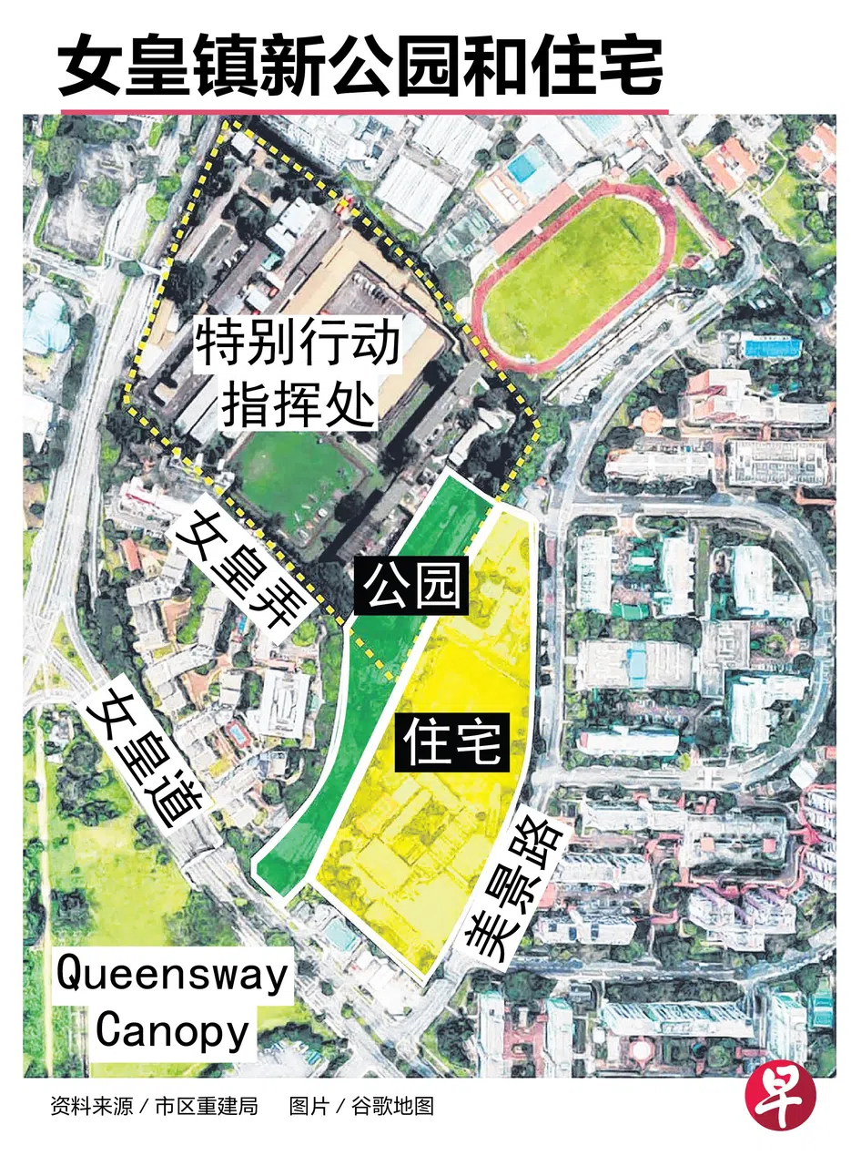 市区重建局于12月8日公布了对发展总蓝图的修订建议,包括未来可能在皇后弄(Queen’s Close)旁边建造一个大约1.4公顷(相当于两个足球场)的新公园。这个规划中公园的范围包括目前的亚历山大与女皇大道公园连道,以及女皇弄组屋旁的一片老树林。毗邻新公园的一块面积3.2公顷的土地已规划为住宅用地,总容积率为3.9。那里原建有美景中学和美景小学,建屋发展局从去年至今年已将两所学校拆除。