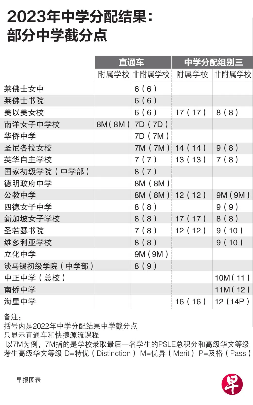 多所热门中学的截分点与去年相比没有明显变化,莱佛士女中、莱佛士书院和美以美女校的直通车课程截分点为六分。同过去两年一样,没有学校出现四分的“完美成绩”或五分的截分点。