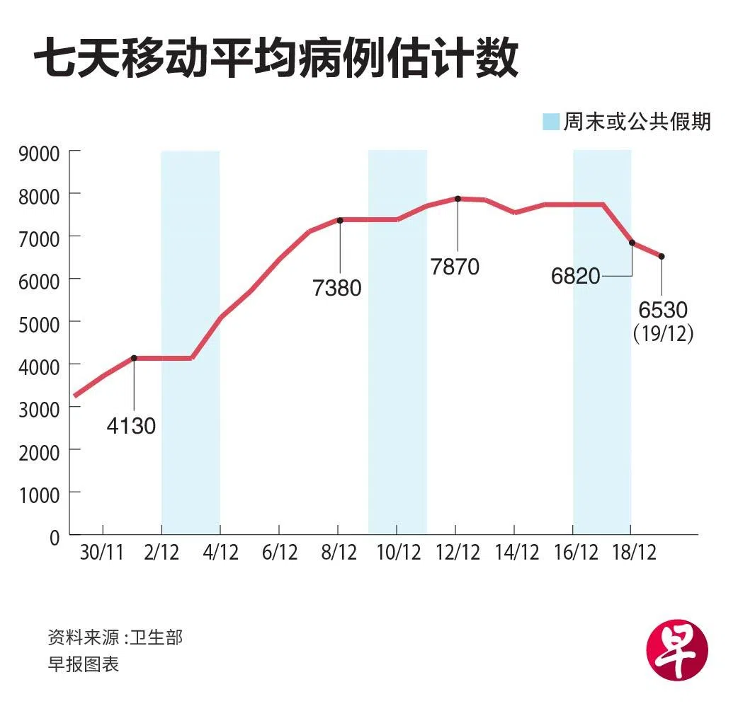 本地冠病七天移动平均病例数连续两天下跌至7000起以下,12月18日的病例估计数为6820起,比前一天减少910起。19日又进一步减少至6530起,比前一天减少290起。